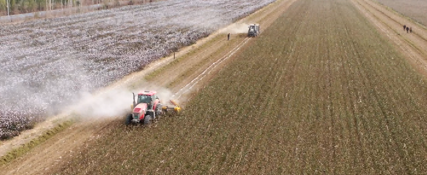 近日,巴州惠疆在尉犁县及哈密地区的农田残膜回收工作正在紧锣密鼓、如火如荼的进行中,打杆机将棉田中的棉杆打断粉碎处理,打杆机后方的搂膜装置将铺在棉田地上的残膜进行聚拢,残膜回收机在田地里来回穿梭,残膜被机器的卷筒快速卷起,集中回收到后置的聚膜框中,机械所过之处,棉田干净平整,残膜回收率能够达到90%以上。?